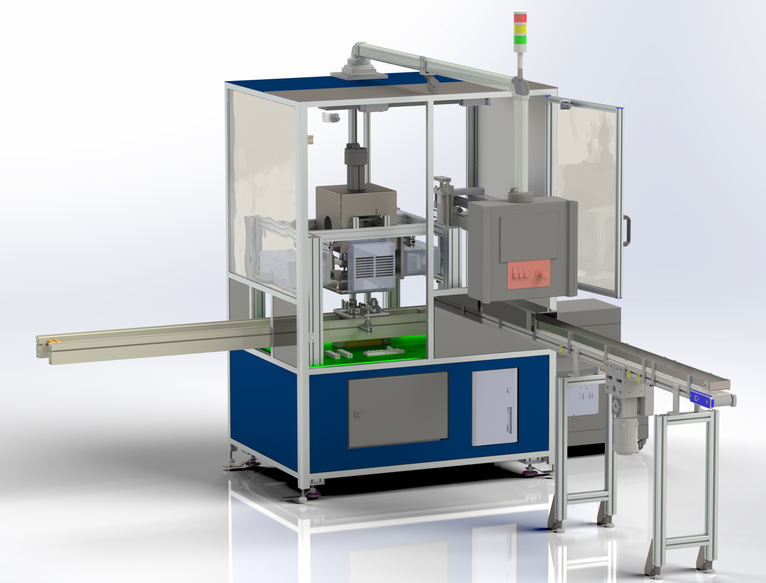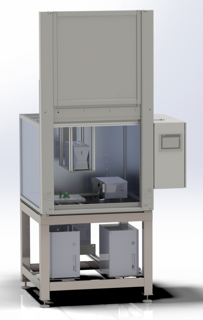 mit Kreuztisch und Schwenkvorrichtung sowie automatischer 2-fach Bauteilzuführung mit Typerkennung mittels industrieller Bildverarbeitung.