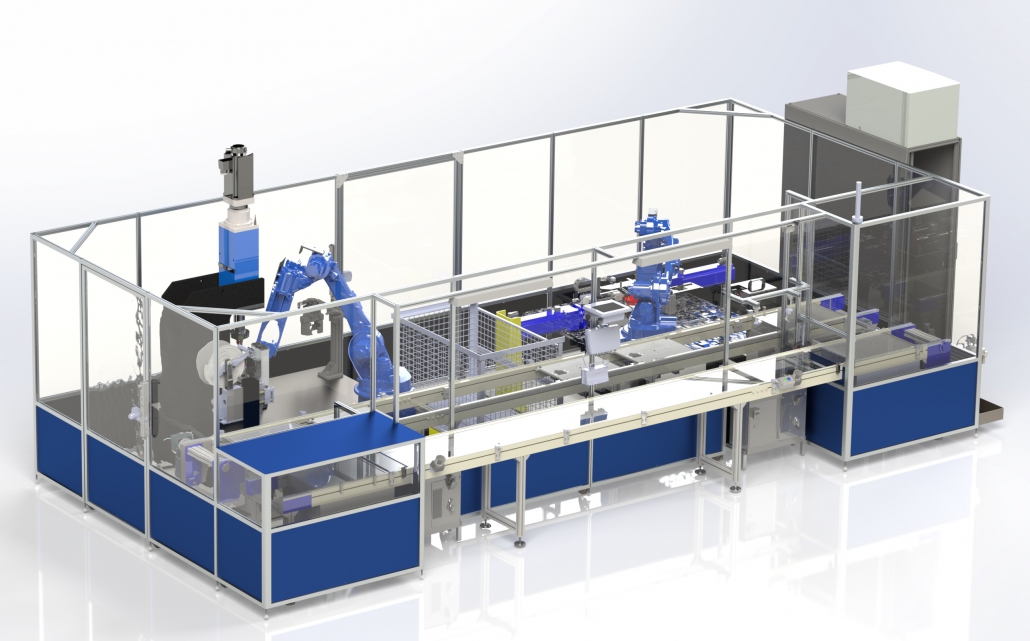 mit Transfersystem zur Integration in eine Montagelinie. Das Bauteil wird mittels Dreh-Hub-Handling von einem Werkstückträger entnommen und in einem Laserschutzraum mit Doppel-Markierkopf (180°-Anordnung) positioniert für eine mehrfach Beschriftung des Bauteils. Anschließend erfolgt eine Verifizierung der Bauteilbeschriftung.